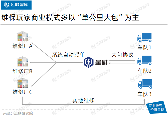 維修連鎖、平臺型玩家們的商業(yè)模式也大致相同,即前端以大包的形式,將物流公司/車隊的維保業(yè)務(wù)以XX元/公里的價格承接下來;然后,將業(yè)務(wù)按訂單的方式分配到下面的連鎖加盟門店。