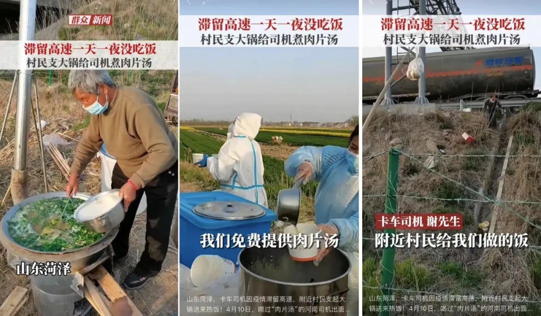 全國多地發(fā)生疫情,受交通管制下的部分司機(jī)滯留在高速上,有些司機(jī)事先沒有準(zhǔn)備,吃喝成了問題。在山東菏澤菏寶高速上,住在附近的熱心村民到高速路下方支起爐灶為司機(jī)們現(xiàn)場煮肉片湯,從早晨5點(diǎn)多到晚上10點(diǎn)多,他們送出了14鍋肉片湯。還有附近村民都自掏腰包給司機(jī)們送來免費(fèi)的方便面、礦泉水,還有熱心超市老板送來小米粥。